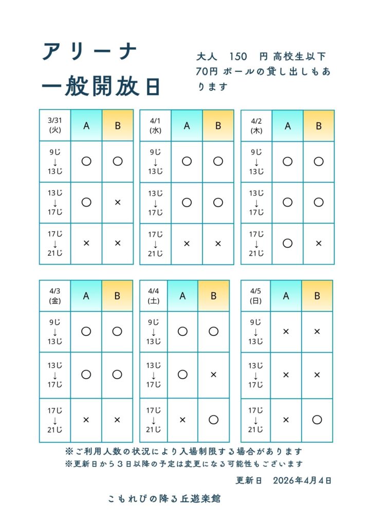 ※改訂版  4/4(土) アリーナ一般開放情報