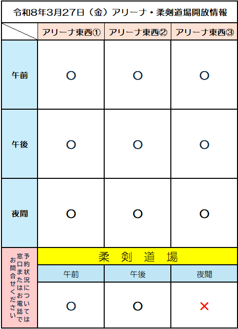 【速報】令和8年3月27日(金)アリーナ・柔剣道場の開放状況
