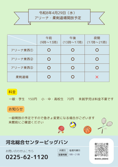 お知らせ 2026年04月29日 河北総合センタービッグバン 【速報】令和8年4月29日(金)アリーナ・柔剣道場の開放状況 アリーナの貸切利用がキャンセルになり、一般開放が1/3面から全面に変わりましたのでお知らせします。