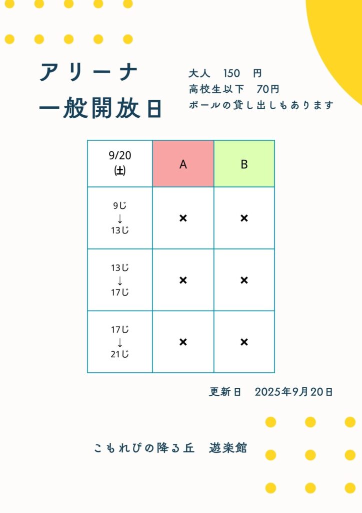 お知らせ 2025年09月20日 こもれびの降る丘遊楽館 アリーナ一般開放状況 本日改訂版 本日のアリーナ一般開放について、内容を一部改訂いたしました。 ご利用の際は、事前に最新情報をご確認いただきますようお願いいたします。 詳しくはお電話にてお問い合わせください。 キャッシュレス決済できます。