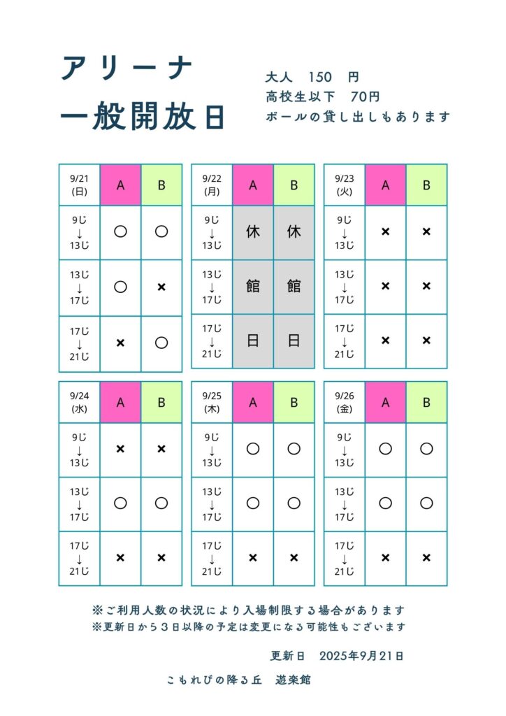 アリーナ一般開放のお知らせ 9/21㈰~26㈮ 改訂版