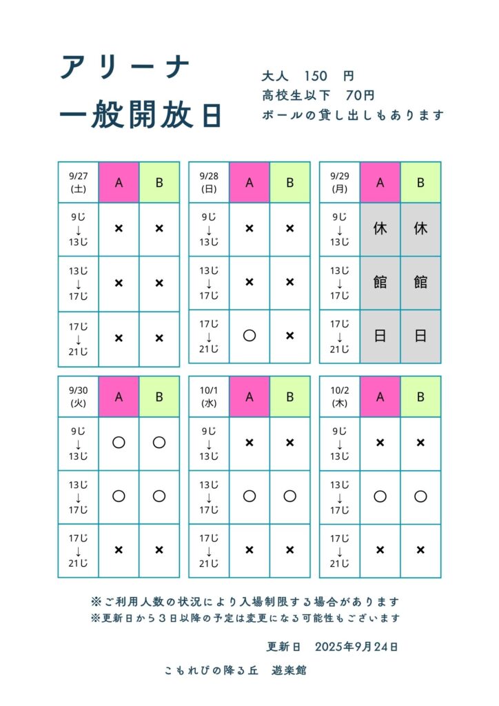 アリーナ一般開放のお知らせ 9/27(土)~10/2(木)
