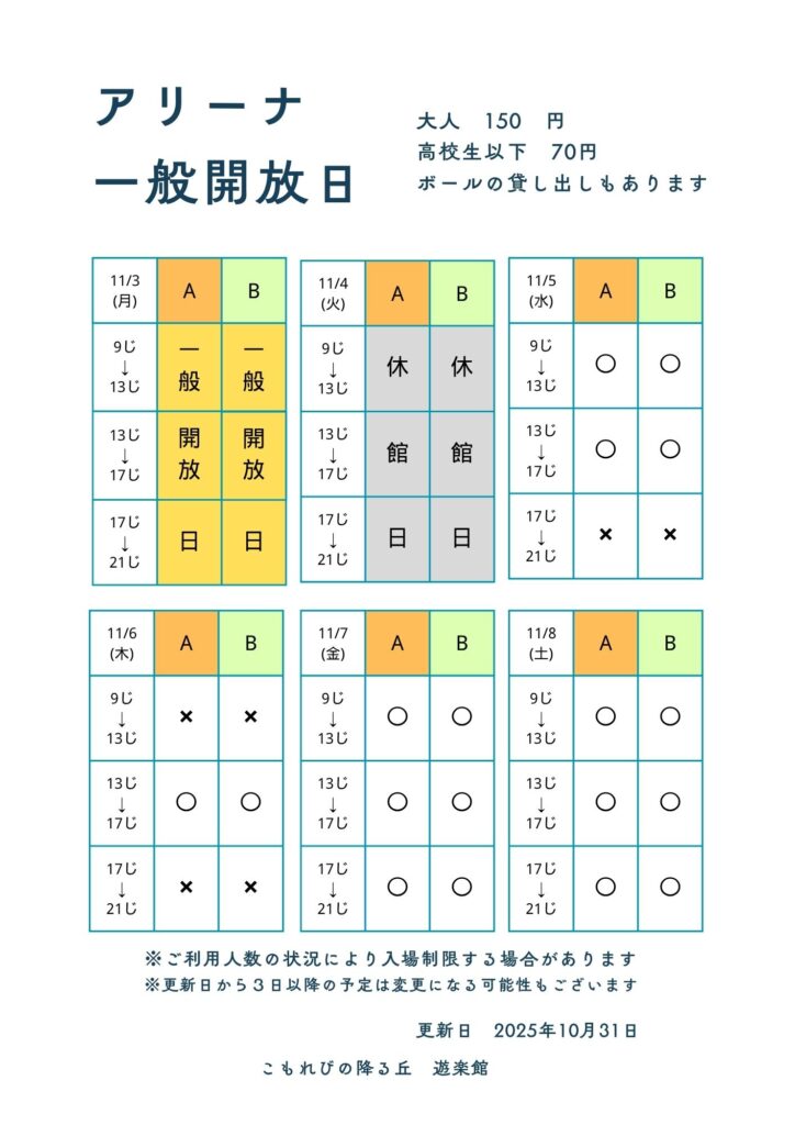 お知らせ 2025年10月31日 こもれびの降る丘遊楽館 アリーナ一般開放情報11/3(月)~11/8(土) ご利用の際は、事前に最新情報をご確認いただきますようお願いいたします。 詳しくはお電話にてお問い合わせください。 キャッシュレス決済できます。