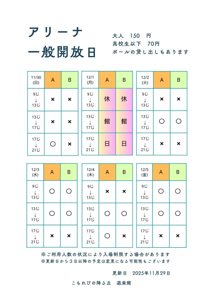 アリーナ一般開放情報11/30(日)~12/5(金)