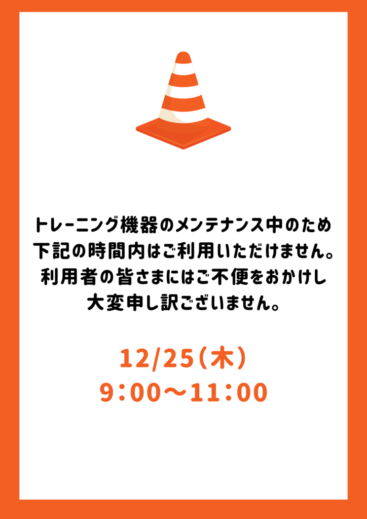 令和7年12月25日(木)9:00~11:00はトレーニング機器のメンテナンス作業があり、そのため時間内はトレーニング室のご利用はいただけませんのでご了承ください。