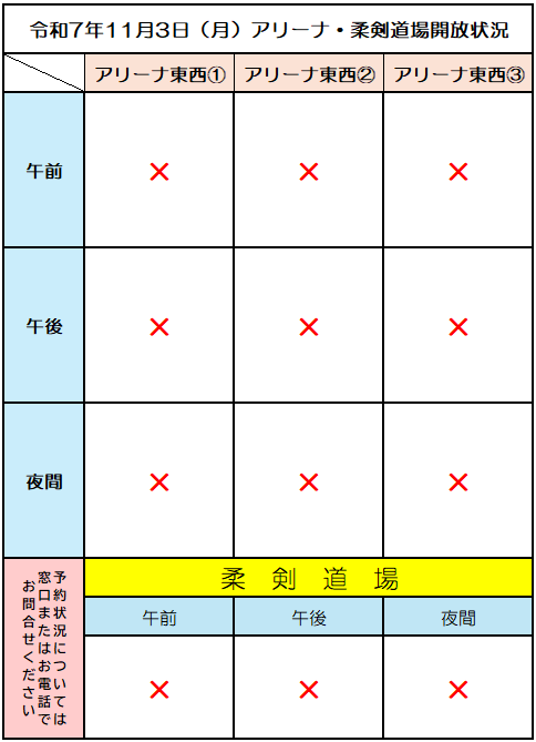 お知らせ 2025年11月02日 河北総合センタービッグバン 令和7年11月3日(月)アリーナ・柔剣道場の開放状況 ☆11月3日(月)は祝日ですがビックバンを会場に かほく文化祭・かほく産業まつりが開催されますので アリーナ・柔剣道場の一般開放はありませんのでご注意ください。 ※トレーニング室の利用も不可となります。