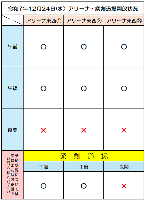 お知らせ 2025年12月23日 河北総合センタービッグバン 令和7年12月24日(水)アリーナ・柔剣道場の開放状況 ※開放状況に変更がありましたら、ホームページまたはInstagramにて更新いたしますので、来館前にご確認ください。みなさまのお越しをお待ちしております!