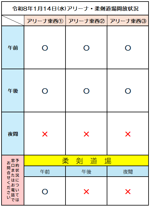 令和8年1月14日(水)アリーナ・柔剣道場の開放状況