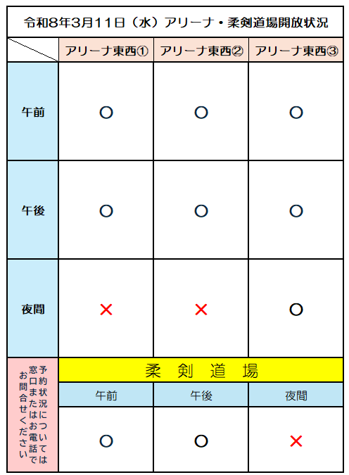 お知らせ 2026年03月10日 河北総合センタービッグバン 令和8年3月11日(水)アリーナ・柔剣道場の利用状況 ※開放状況に変更がありましたら、ホームページまたはInstagramにて更新いたしますので、来館前にご確認ください。