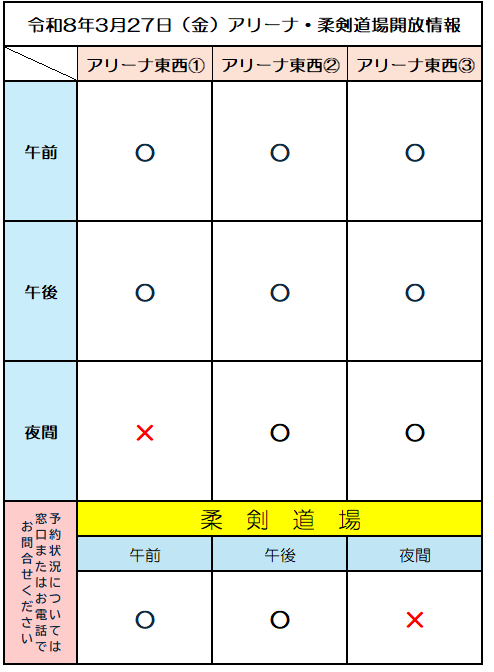 お知らせ 2026年03月26日 河北総合センタービッグバン 令和8年3月27日(金)アリーナ・柔剣道場の開放予定 ※開放状況に変更がありましたら、ホームページまたはInstagramにて更新いたしますので、来館前にご確認ください。