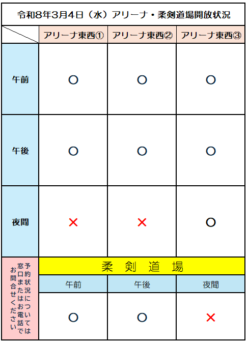 お知らせ 2026年03月03日 河北総合センタービッグバン 令和8年3月4日(水)アリーナ・柔剣道場の利用状況 ※開放状況に変更がありましたら、ホームページまたはInstagramにて更新いたしますので、来館前にご確認ください。