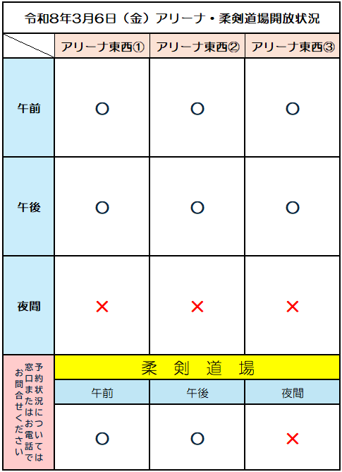 お知らせ 2026年03月05日 河北総合センタービッグバン 令和8年3月6日(金)アリーナ・柔剣道場の利用状況 ※開放状況に変更がありましたら、ホームページまたはInstagramにて更新いたしますので、来館前にご確認ください。