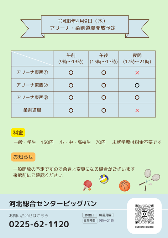 お知らせ 2026年04月08日 河北総合センタービッグバン 令和8年4月9日(木)アリーナ・柔剣道場の開放予定 ※開放状況に変更がありましたら、ホームページまたはInstagramにて更新いたしますので、来館前にご確認ください。