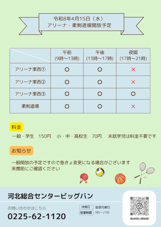 お知らせ 2026年04月14日 河北総合センタービッグバン 令和8年4月15日(水)アリーナ・柔剣道場の開放予定 ※開放状況に変更がありましたら、ホームページまたはInstagramにて更新いたしますので、来館前にご確認ください。