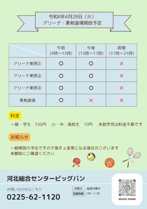 お知らせ 2026年04月26日 河北総合センタービッグバン 令和8年4月28日(火)アリーナ・柔剣道場の開放予定 明日、4月27日(月)はビッグバン休館日です。次の開館日は4月28日(火)となります。 ※開放状況に変更がありましたら、ホームページまたはInstagramにて更新いたしますので、来館前にご確認ください。
