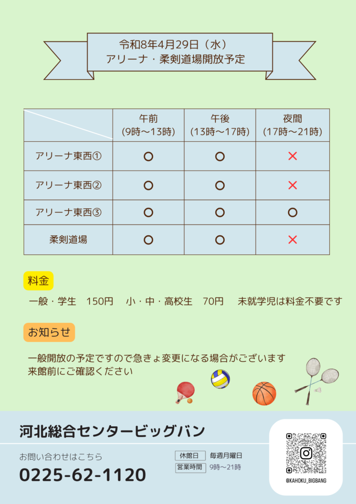 お知らせ 2026年04月28日 河北総合センタービッグバン 令和8年4月29日(水)アリーナ・柔剣道場の開放予定 ※開放状況に変更がありましたら、ホームページまたはInstagramにて更新いたしますので、来館前にご確認ください。
