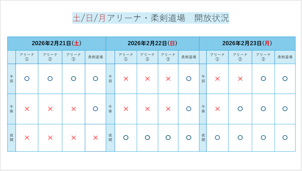 土・日・祝(月)のアリーナ・柔剣道場の開放状況