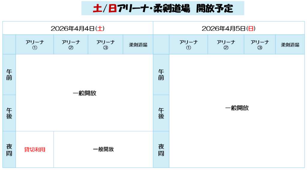 お知らせ 2026年04月03日 河北総合センタービッグバン 土日のアリーナ・柔剣道場の開放予定 ※開放状況に変更がありましたら、ホームページまたはInstagramにて更新いたしますので、来館前にご確認ください。