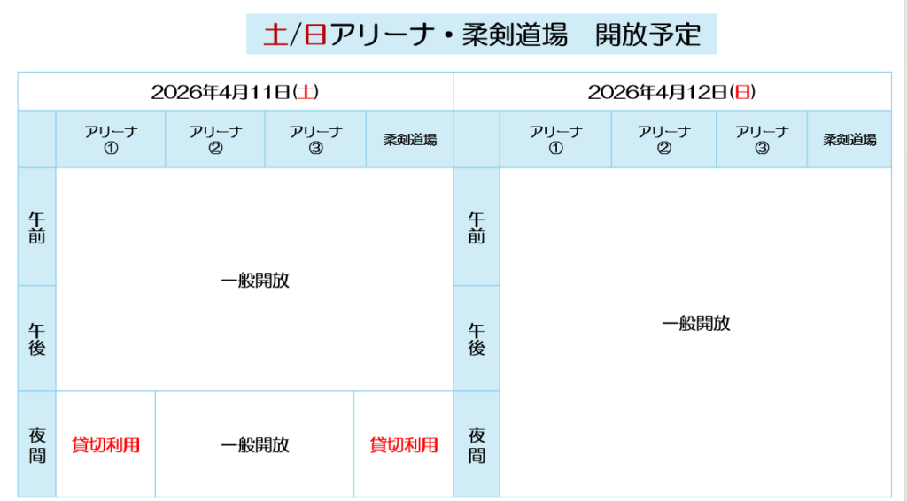 お知らせ 2026年04月10日 河北総合センタービッグバン 土日のアリーナ・柔剣道場の開放予定 ※開放状況に変更がありましたら、ホームページまたはInstagramにて更新いたしますので、来館前にご確認ください。