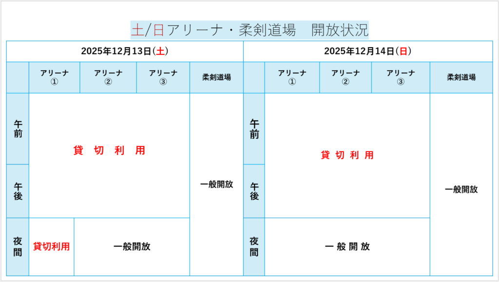 土日のアリーナ・柔剣道場の開放状況