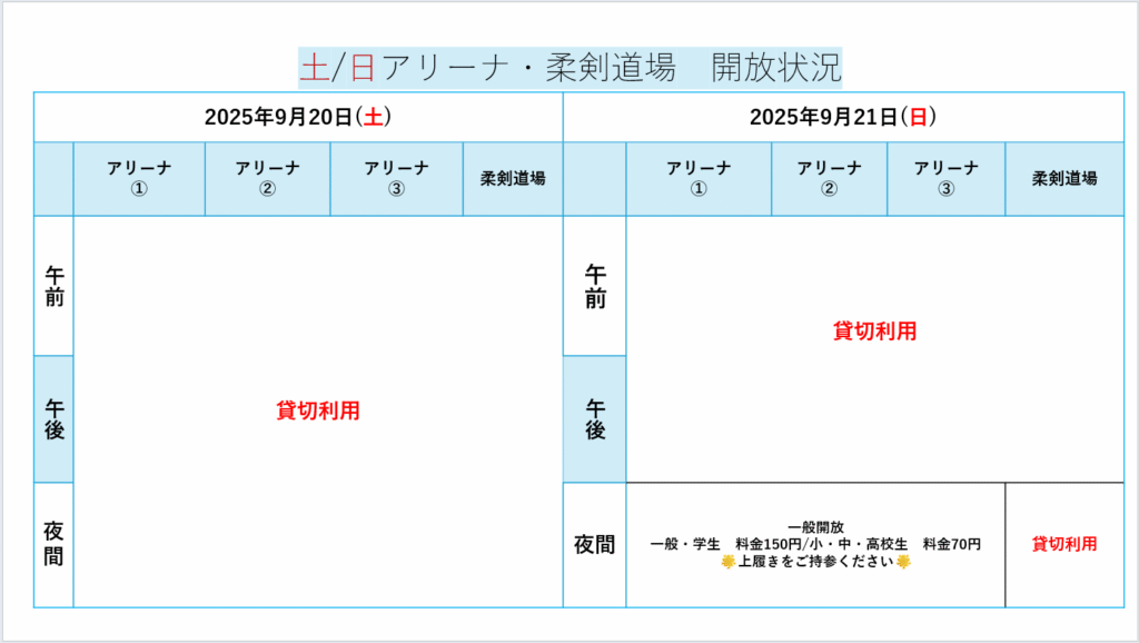 土日のアリーナ・柔剣道場の開放状況