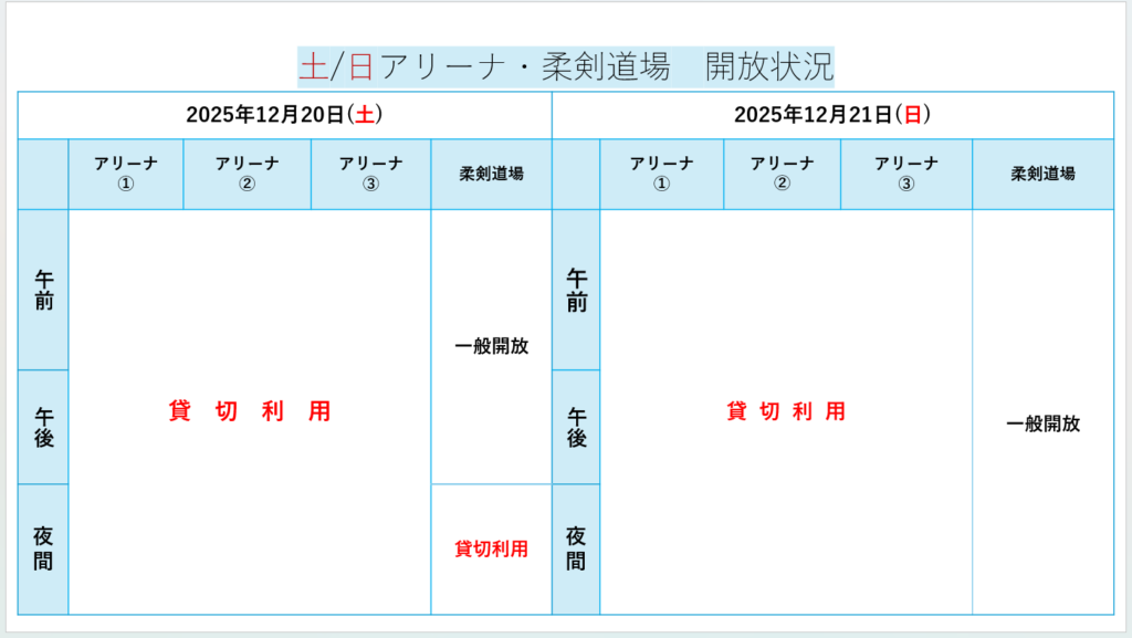 ☆ビックバンの土・日のアリーナと柔剣道場の開放は以下の通りになります!