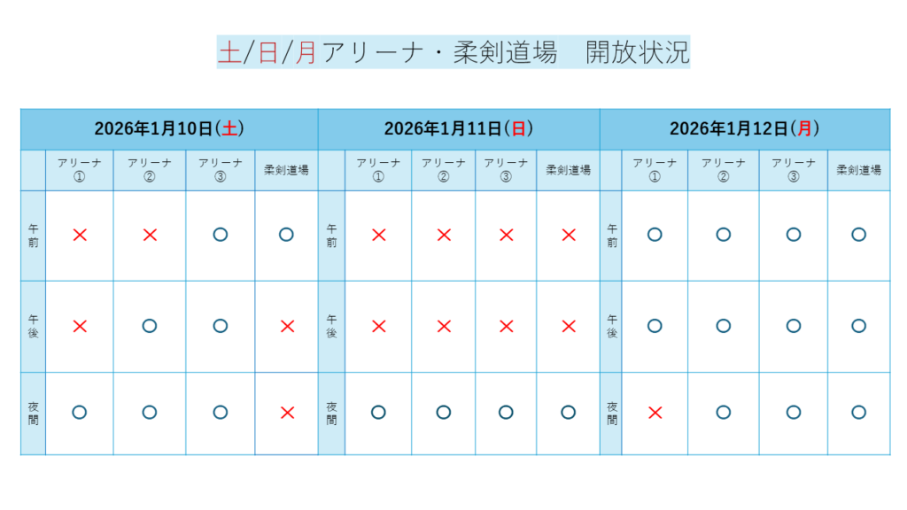 土/日/月(祝日)のアリーナ・柔剣道場の開放状況