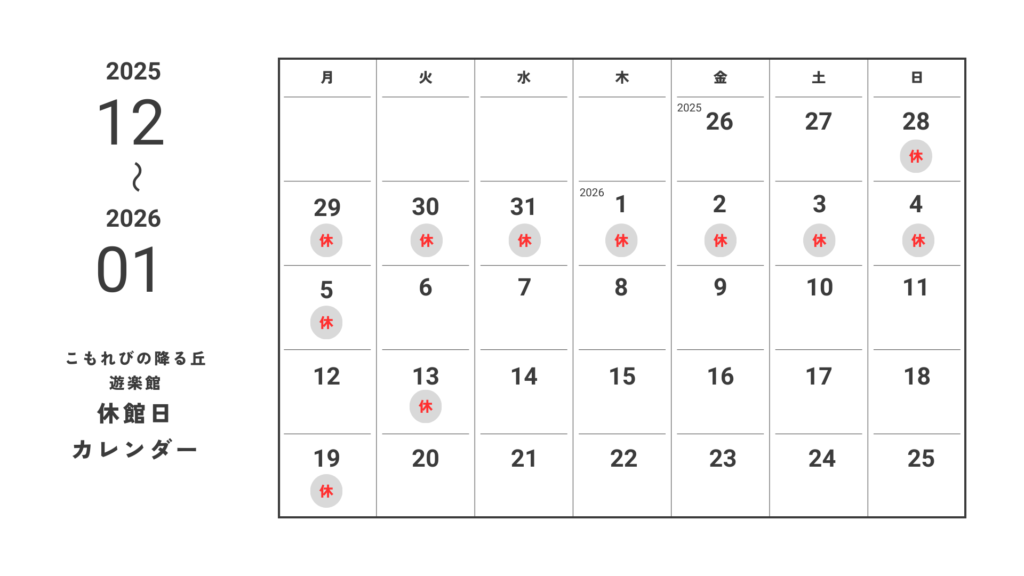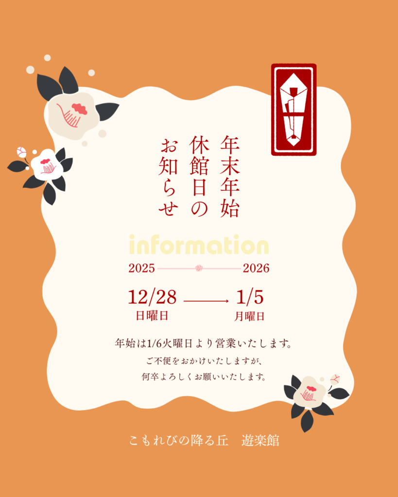2025年12月28日(日)~2026年1月5日(月)まで休館日となります。