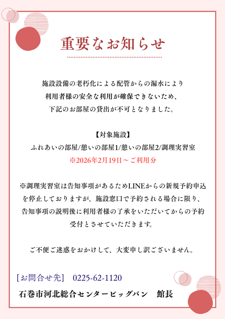 お知らせ 2026年02月19日 河北総合センタービッグバン 施設利用に関する重要なお知らせ いつもご利用いただきありがとうございます。 令和8年2月19日(木)より施設設備の老朽化による配管からの漏水により利用者様の安全な利用が確保で一部お部屋の貸出が不可となりました。 詳しくは下記の画像を参照ください。