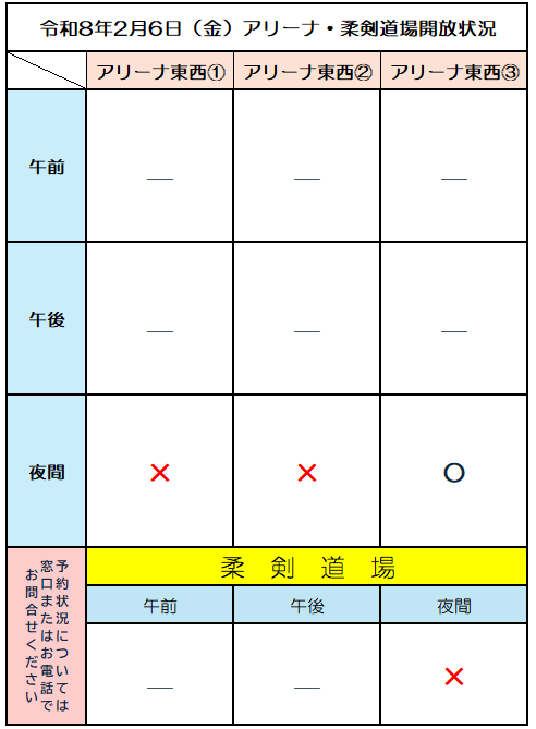 お知らせ 2026年02月06日 河北総合センタービッグバン *続報*令和8年2月6日(金)アリーナ・柔剣道場の開放状況 アリーナの解放状況に変更がありました。1/3面ご利用可能になりましたのでお知らせします。