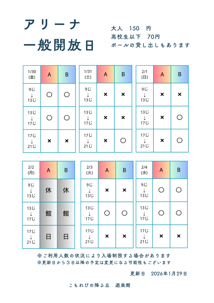 お知らせ 2026年02月01日 こもれびの降る丘遊楽館 1/30(金)~2/4(水) アリーナ一般開放情報 1/30(金)~2/4(水) アリーナ一般開放について一部変更がありましたので、再度お知らせいたします。 nstagram・Xも更新しています! SNSではアリーナ一般開放情報やイベント情報を発信中!皆さまのフォローお待ちしています◎ ご利用の際は最新情報をご確認いただくようお願いいたします。 キャッシュレス決済が使えます。