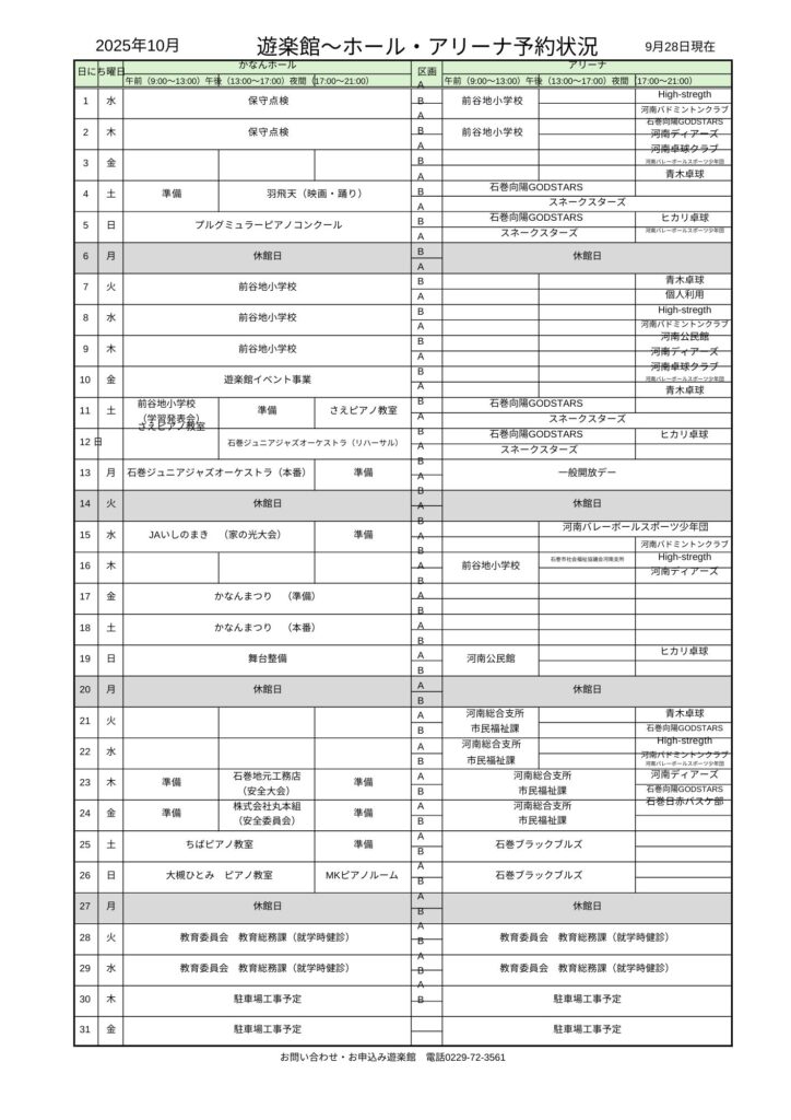 いつも遊楽館をご利用いただき、ありがとうございます。10月の行事予定についてお知らせです。
