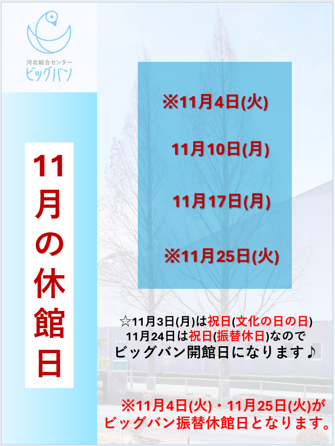 お知らせ 2025年11月05日 河北総合センタービッグバン 11月の休館日のお知らせです♪ いつも河北総合センタービッグバンをご利用いただき、ありがとうございます。 11月の休館日は下記日程になります。