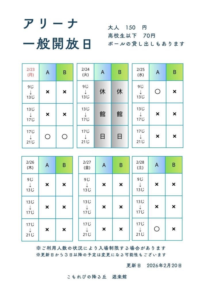 お知らせ 2026年02月21日 こもれびの降る丘遊楽館 2/23(月)~2/28(土)アリーナ一般開放情報 アリーナ一般開放情報のお知らせです🏀 nstagram・Xでも更新しています! SNSではアリーナ一般開放情報やイベント情報を発信中!皆さまのフォローお待ちしています◎ ご利用の際は最新情報をご確認いただくようお願いいたします。 キャッシュレス決済が使えます。