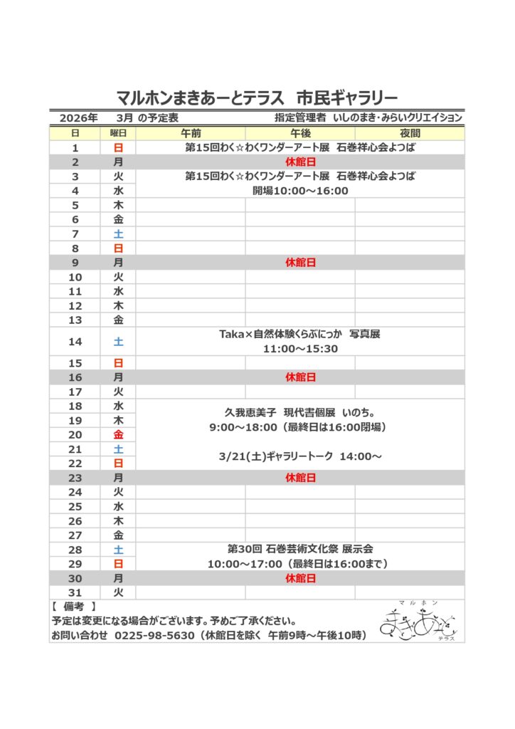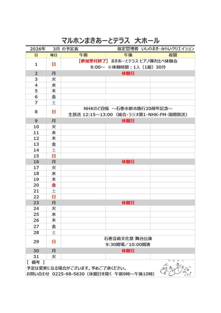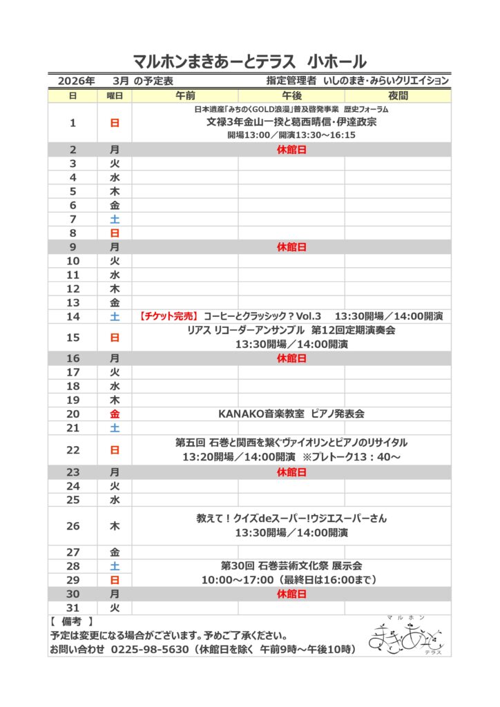 お知らせ 2026年02月23日 マルホンまきあーとテラス 3月のイベントスケジュール いつもマルホンまきあーとテラスをご利用いただき、ありがとうございます。3月のイベントスケジュールをお知らせいたします。 大ホール 小ホール 市民ギャラリー