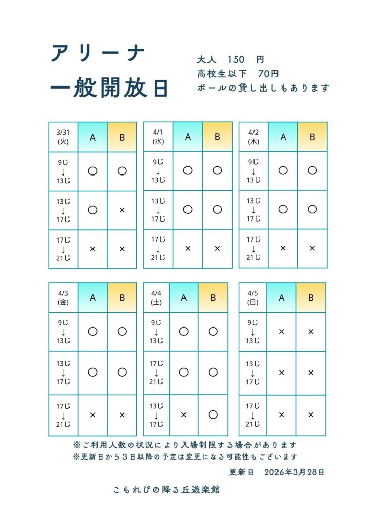 お知らせ 2026年03月28日 こもれびの降る丘遊楽館 3/31(火)~4/5(日)アリーナ一般開放情報 アリーナ一般開放情報のお知らせです🏀 nstagram・Xでも更新しています! SNSではアリーナ一般開放情報やイベント情報を発信中!皆さまのフォローお待ちしています◎ ご利用の際は最新情報をご確認いただくようお願いいたします。 キャッシュレス決済が使えます。