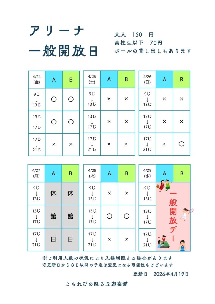 お知らせ 2026年04月24日 こもれびの降る丘遊楽館 4/24(金)~4/29(水)アリーナ一般開放情報 アリーナ一般開放情報のお知らせです! instagram・Xでも更新しています。 ご利用の際は最新情報をご確認いただきますようお願いいたします。