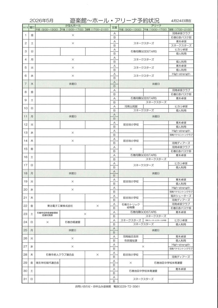 お知らせ 2026年04月28日 こもれびの降る丘遊楽館 5月かなんホール・アリーナ 行事予定 いつもこもれびの降る丘 遊楽館をご利用いただき、ありがとうございます。 5月かなんホール・アリーナ予定のお知らせです! Instagram・Xも更新しています! SNSではアリーナ一般開放情報やイベント情報を発信中!皆さまのフォローお待ちしています◎