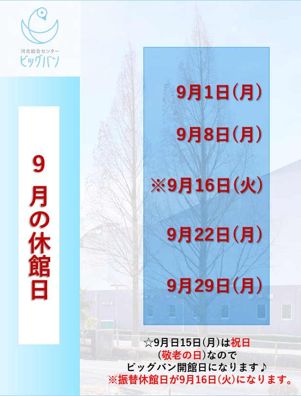 河北総合センタービッグバンより9月の休館日案内のお知らせです。