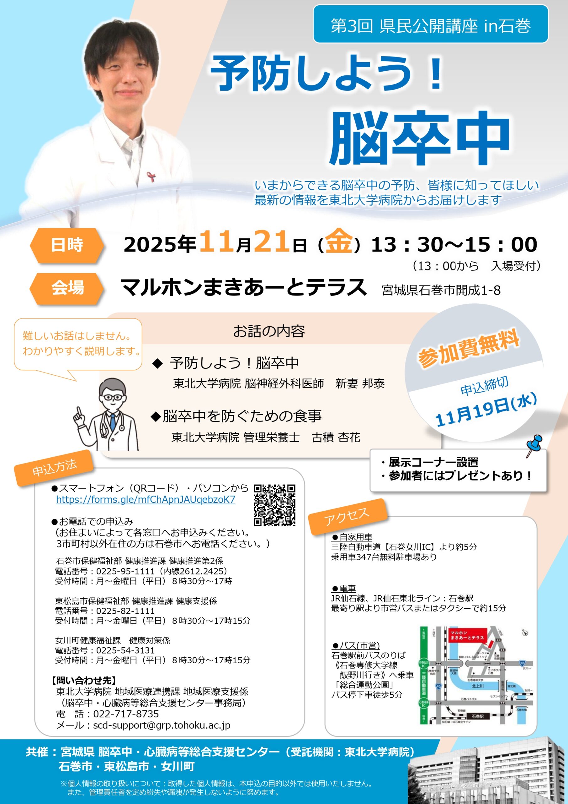 2025年度 第3回東北大学病院脳卒中・心臓病等総合支援センター県民公開講座in石巻開催のお知らせ(11/21開催) – 東北大学病院
