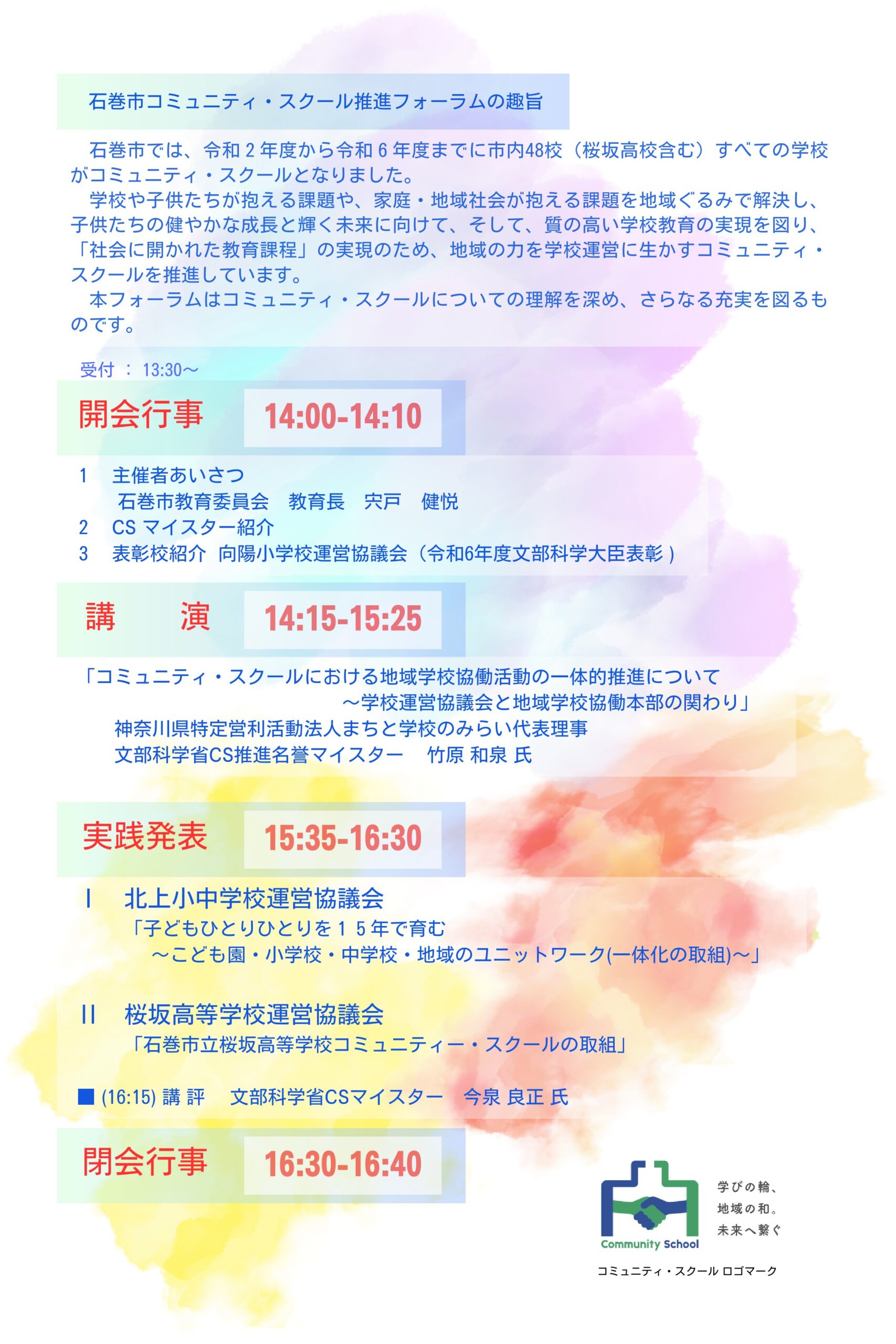 | 主催 | 石巻市教育委員会、石巻市コミュニティ・スクール検討推進委員会 |