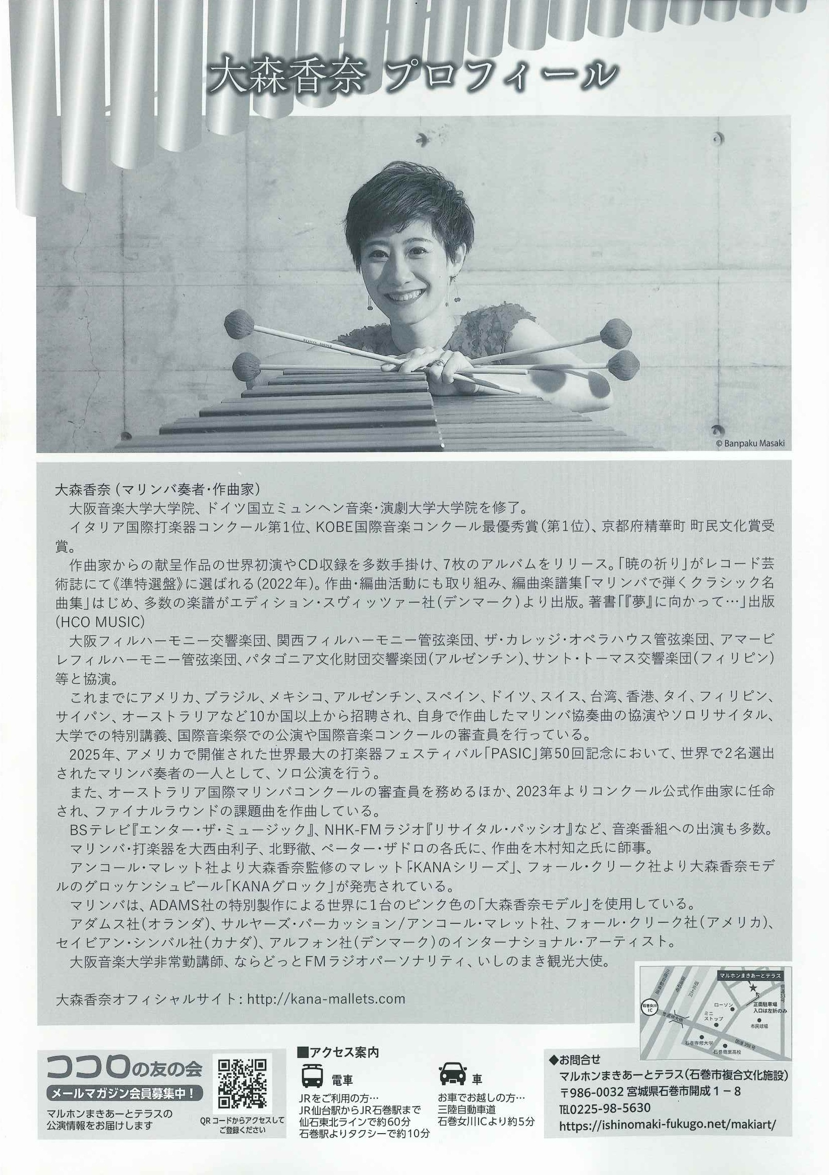 | プログラム | 大森香奈作曲/マリンバ協奏曲[サンダーバード] 大森香奈作曲/ヤンバルクイナ (2025年オーストラリア国際マリンバコンクール課題曲) 大森香奈作曲/新曲初演(タイトル未定) |