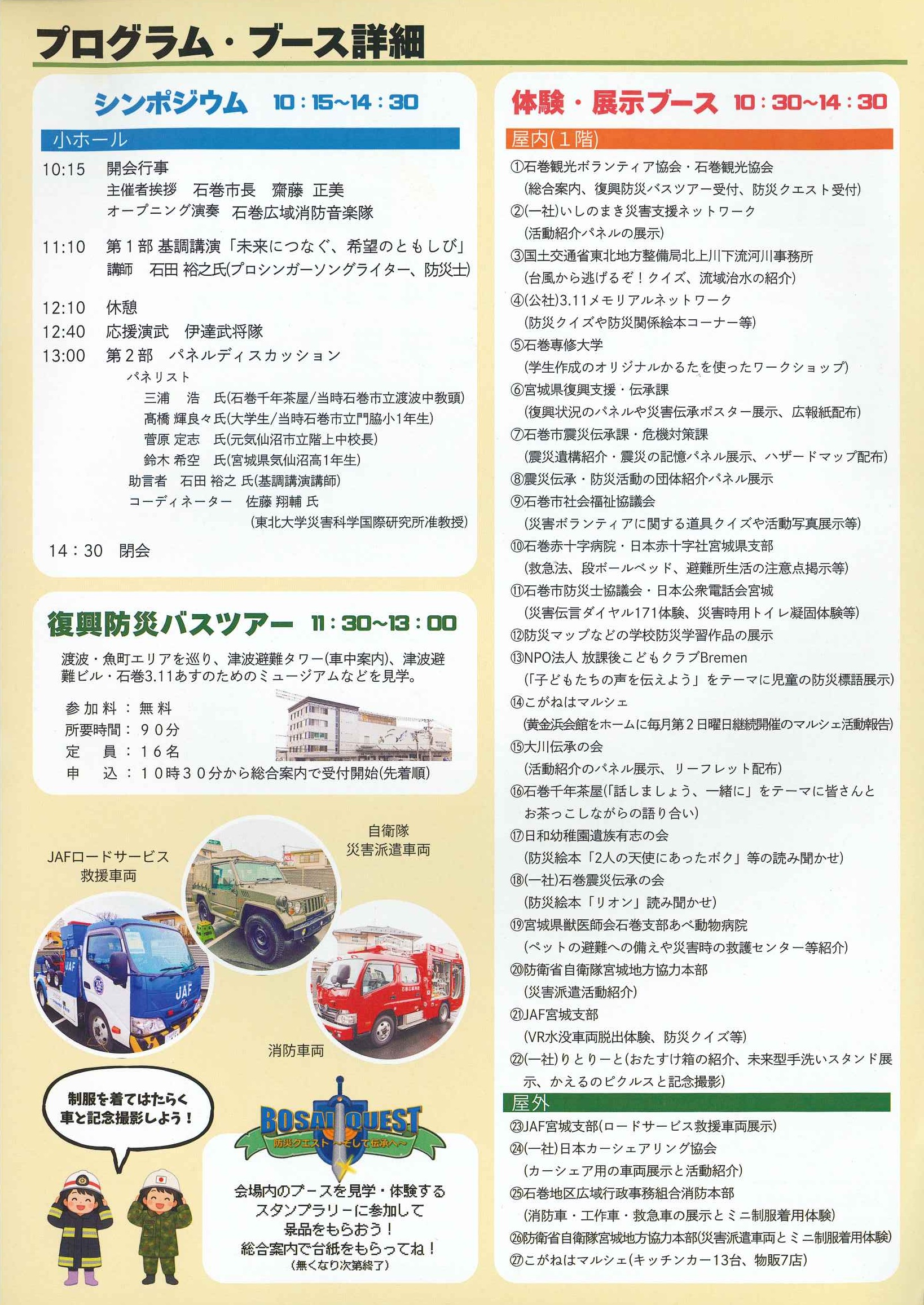 | プログラム | ◆シンポジウム「30年後、そしてその先の震災伝承」 ・【体験・展示ブース】10:30~14:30 ・【復興防災バスツアー】 11:30~13:00(90分) ★開会式やシンポジウムなど会場の様子をYouTubeでライブ配信します (ライブページはこちら) ★会場内のブースを体験・見学することで景品がもらえるスタンプラリー(防災クエスト)を実施します |