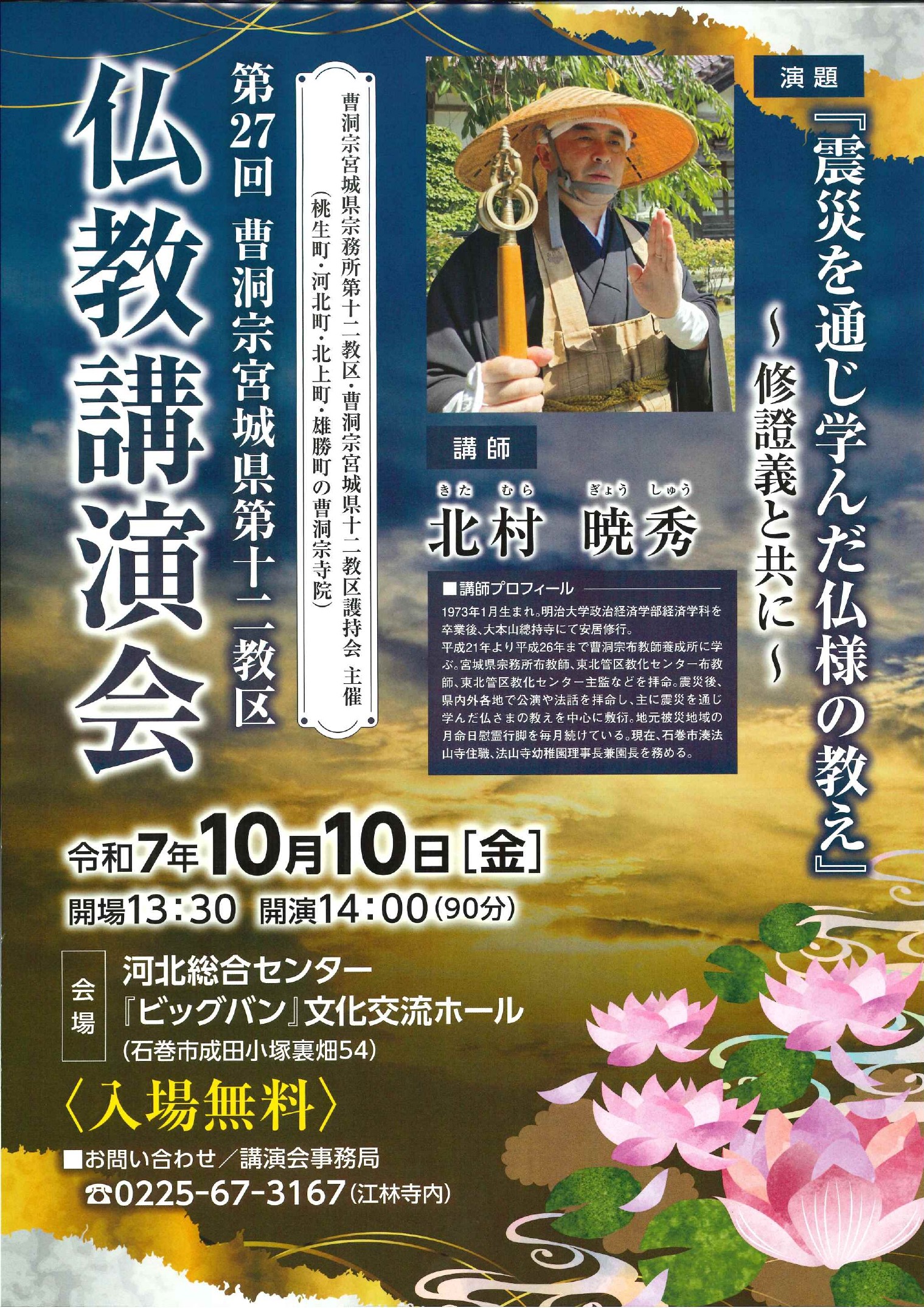 イベント 河北総合センタービックバンのイベント 2025.10.10(金) 河北総合センタービックバン 第27回 曹洞宗宮城県第十二教区 仏教講演会 2025.10.25(土) 河北総合センタービックバン トレーニング講習会【10月】
